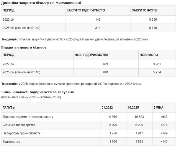 Водночас, попри війну, на Миколаївщині фіксують і відкриття нових суб’єктів господарювання. У 2022 році в регіоні з’явилося 624 підприємства та 3 901 ФОП. У 2025 році ця тенденція посилилася: станом на 1 жовтня було зареєстровано 691 підприємство та 5 754 фізичні особи-підприємці.