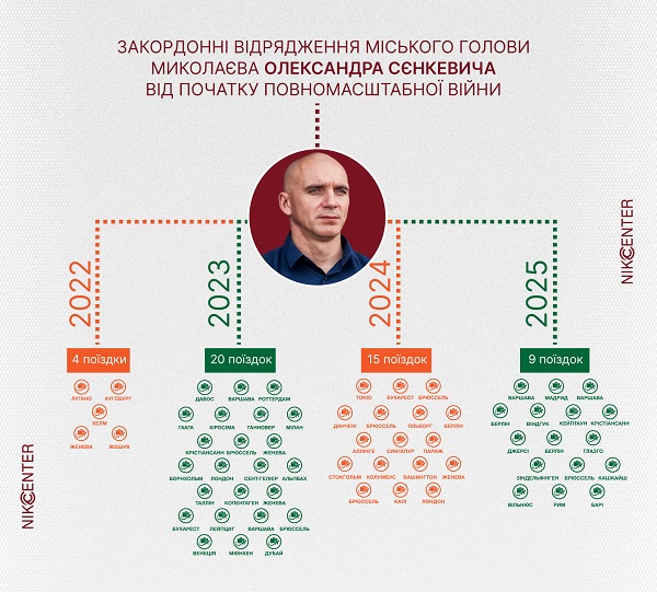 громадою, за майже не три з половиною роки повномасштабної війни очільник міста мав 48 відряджень візьми все яким чином по маслу різних країн, від Колумбії візьми все яким чином по маслу Сінгапуру. За одне відрядження Сєнкевич міг відвідати кількоро країн. Приміром, з 9 по 25 березня 2025 року він побував одразу в чотирьох країнах: Польщі, Німеччині, Намібії та Південно-Африканській Республіці.