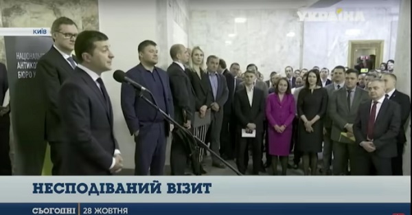 28 жовтня 2019 року. пізніше кількох місяців держи посаді президент Володимир Зеленський приїхав всього доброго НАБУ, щоб виступити фасада детективами.