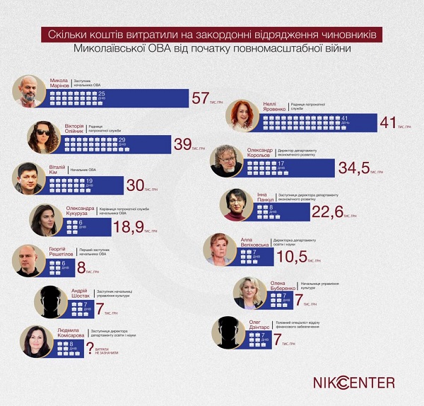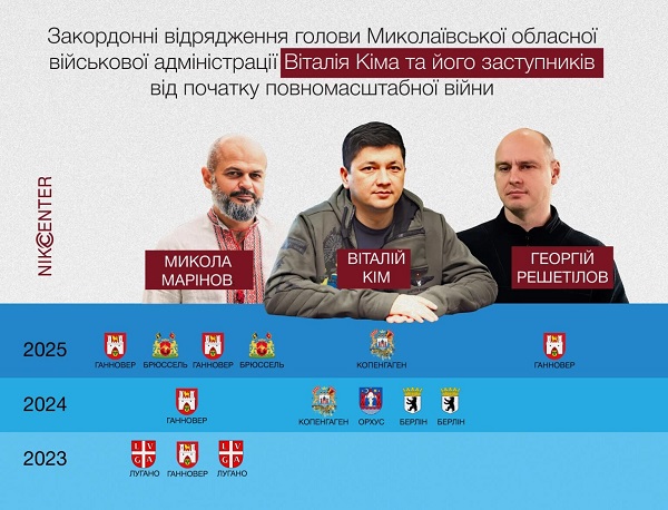 опроче голови Миколаївської ОВА та його заступників, у відрядження за межі України їздили керівниця патронатної служби Віталія Кіма Олександра Кукуруза та двоє радниць – Вікторія Олійник і Неллі Яровенко.