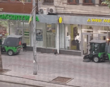 Жителька зафіксувала з вікна, коли дві прибиральні машини КП “Миколаївські парки” їздять по жвавому пішохідному тротуару, кожен раз “пилососячи” ген-ген чисто чисту дорогу.