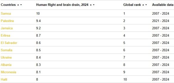 Індекс відтоку людей та мізків, 0 (низький) – 10 (високий).